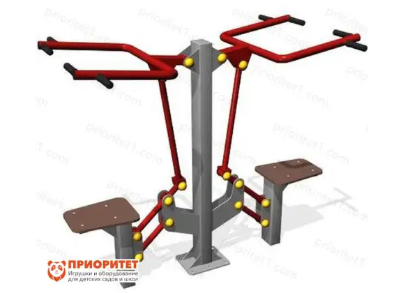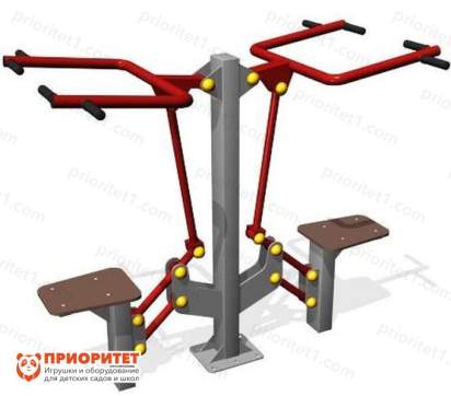 Двойной уличный тренажер для развития мышц рук, груди и верхнего плечевого пояса. Тренажер имеет два вида рукояток для узкого и широкого хвата. Он предназначен для установки на детские и спортивные площадки и может одновременно использоваться двумя людьми. Прочная конструкция из современных материалов выдерживает интенсивные нагрузки и не боится погодных капризов. При сборке были соблюдены все требования безопасности – антискользящие сидения и рукоятки, скошенные углы и заглушки на элементах фурнитуры.
