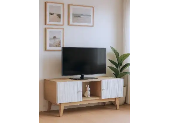 - Сочетание материалов и цветов: фасады тумбы выполнены в белом цвете с вертикальной текстурой, а корпус и ножки — в тёплом оттенке «сонома». Такое сочетание создаёт визуальный баланс и добавляет изделию лёгкости.