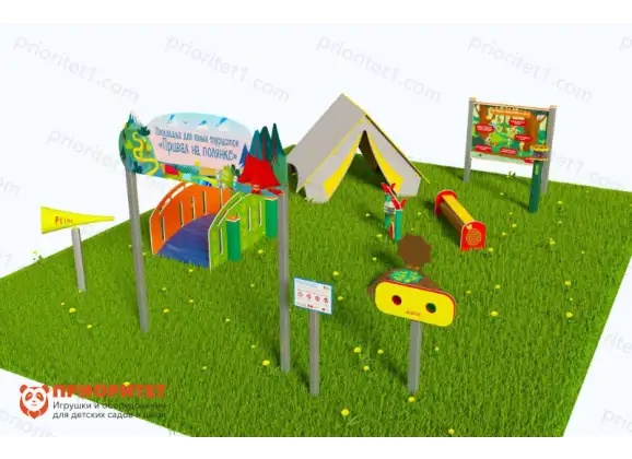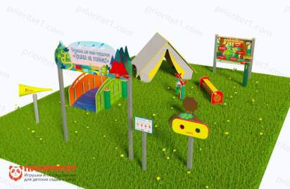 - Игровая зона «Привал на полянке»: Палатка (на выбор 9 видов) из экопластика и нержавеющей стали, лавка-бревно, котелок на стойках и костер, гитара, фонарик, компас;