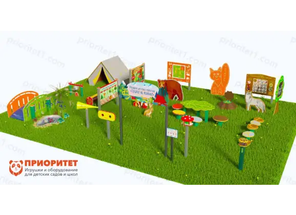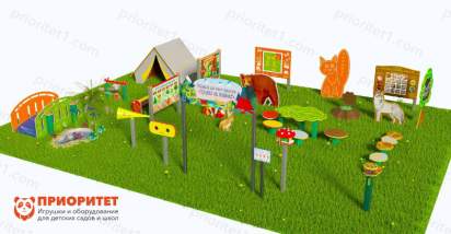 - Игровая зона «Привал на полянке»: Палатка (на выбор 9 видов) из экопластика и нержавеющей стали, лавка-бревно, котелок на стойках и костер, гитара, фонарик, компас;