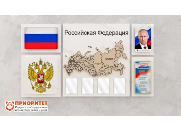 - На стенде представлена карта России с регионами и региональными центрами, что позволяет детям изучать географию своей страны. Они могут узнать больше о различных регионах, их особенностях и достопримечательностях.