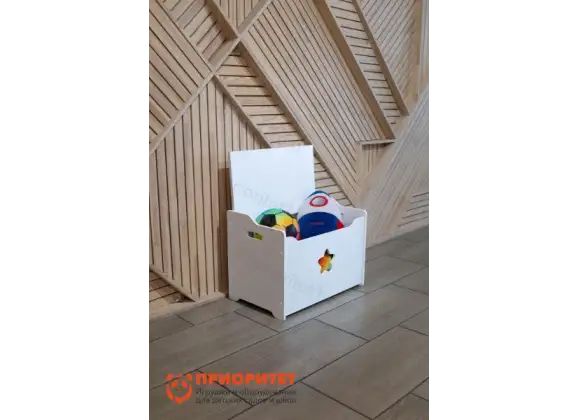 Благодаря вырезу-звёздочке на передней панели ящик выглядит нарядно и привлекательно. Этот элемент не только украшает изделие, но и добавляет воздуха конструкции. Крышка открывается вверх, обеспечивая быстрый доступ к содержимому. Внутри поместятся мячи, конструкторы, мягкие игрушки и многое другое.