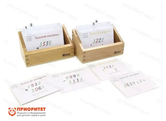 Набор предназначен для закрепления полученных знаний и совершенствования навыков. В комплекте предоставлено 130 карточек в двух коробочках. Карточки в каждом разделе включают в себя примеры на арифметическое действие. Все они располагаются под определенным номером и постепенно усложняются. Для контроля на обратной стороне размещен ответ. Так ребенок сможет самостоятельно выполнять задание и контролировать себя.
