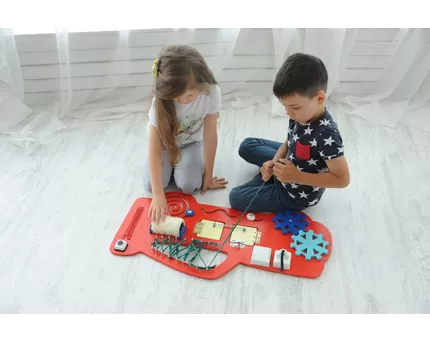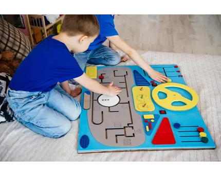 - Развитие моторики, координации: Игра требует от детей использования мелкой моторики, такой как нажатие кнопок или поворот колес. Они активно тренируют свои пальцы и руки, развивая тактильные навыки, координацию движений. Бизиборды предлагают разное сопротивление и силу для некоторых активностей, так что дети могут также развивать силу своих мышц.