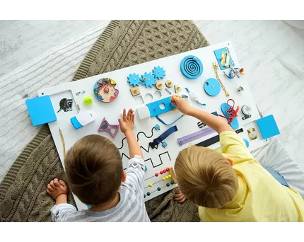 Главная идея развивающей программы бизиборда - применение природного любопытства и естественного желания малышей исследовать мир. Вместо того, чтобы запрещать ребенку трогать розетки, замки, пуговицы и т.д., используйте их в игре. Когда обычные бытовые предметы надежно закреплены на одной поверхности, вероятность травмирования и проглатывания минимальна.