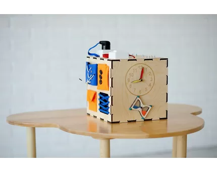 Бизикуб состоит из пяти скрепленных между собой панелей. Каждая сторона имеет уникальную комплектацию, а развивающие элементы распределены согласно уровню их сложности. Верх кубика полностью плоский. Поэтому при выборе игрушки учитывайте его размеры. Малышам будет трудно тянуться через весь куб. Во время игры с большим бизикубом крохе придется постоянно нагибаться либо стоять на коленках.