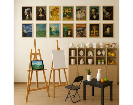 - Репродукции картин, постеры с информацией о художниках и стилях.