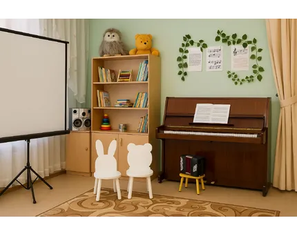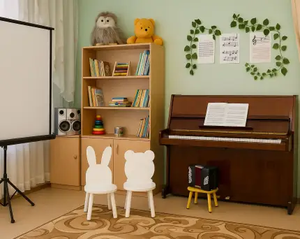 Если в ДОУ есть отдельное помещение для музыкальных занятий, часть пространства можно выделить под постоянный уголок с инструментами. Это создаёт устойчивую ассоциацию: здесь звучит музыка, здесь можно экспериментировать, импровизировать.