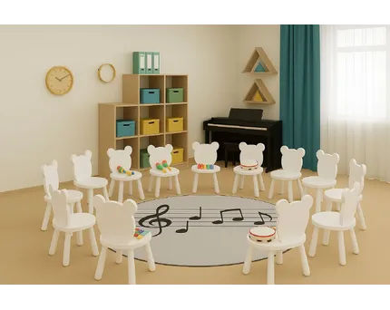 Выбирая оборудование, обратите внимание на прочность материалов, устойчивость мебели, качество звучания инструментов, их педагогическую ценность. Хорошо, если они входят в готовые комплекты — это экономит время и позволяет не упустить важные позиции.