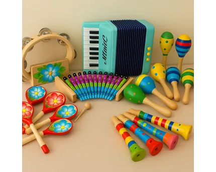 - Младшие группы (2–3 года): простейшие шумовые инструменты — маракасы, трещотки, бубны. Главное — лёгкость и безопасность.