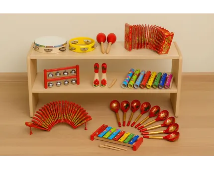 - Средние группы (4–5 лет): добавляются металлофоны, ложки, треугольники, простейшие ритмические упражнения.