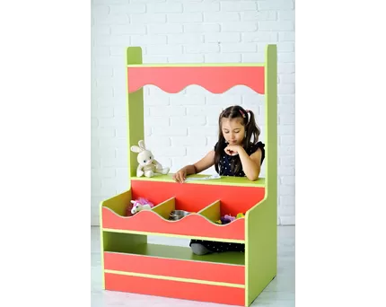 Игровое оборудование «Магазин». Это магазинная лавка с пустыми полками и ящиками для продуктов. Дети могут разыграть здесь сценку из «Буратино», когда мальчик приходит в книжный магазин, чтобы купить азбуку.
