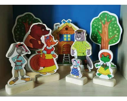 Стендовый театр представляет собой определенную поверхность, на которую крепят декорации и фигурки. Действие происходит в пределах этой поверхности. Легкими движениями воспитатель создает реальность сказки: ставит и перемещает фигурки, подражает их голосам, взмахивает руками или топает ногами на драматичных моментах. А при первом появлении героя дети могут угадывать, кто это. Бывает: