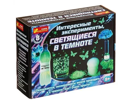 Набор «Светящиеся в темноте» – необычный эксперимент, в котором детям предстоит создать светящиеся фигуры. Они могут сами выбирать емкости для игры и фантазировать.