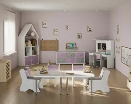- Столы и стулья. Лучше всего использовать регулируемые по высоте модели, чтобы адаптировать пространство под детей разного возраста, роста. Стулья должны быть комфортными, безопасными, с учетом анатомических особенностей детей.