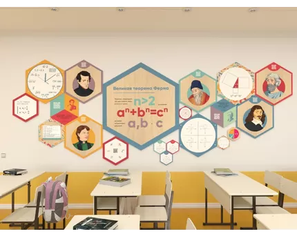 - Зона наглядности — стенды, таблицы, иллюстрирующие ключевые математические темы: формулы, графики, схемы, исторические сведения.
