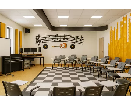 - Физическое пространство и акустика. Помещение, где проходят занятия, должно обладать хорошими акустическими характеристиками. Важно, чтобы звук распространялся равномерно, не искажался и не поглощался стенами или мебелью. Также необходимо предусмотреть звукоизоляцию, чтобы занятия не мешали другим классам. Пространство должно быть достаточно вместительным для организации как индивидуальной, так и групповой работы.