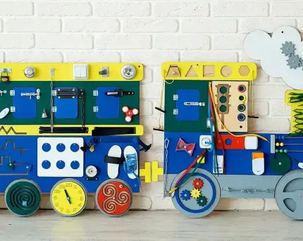 - Набор бизибордов «Любимая сказка». Семь панелей в виде сказочных персонажей научат ребят читать, считать, застегивать пуговицы и др.