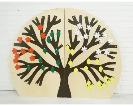 - Развивающая панель «Времена года». На декоративное дерево можно цеплять «листики» в виде времен года: снежинка, цветок, листик зеленый и красный.