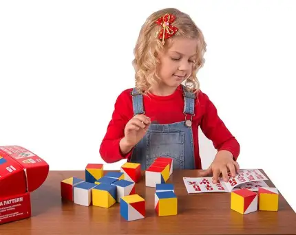 - Сложи узор по образцу. Используя методические материалы, предложите ребенку собрать узор по образцу на картинке. Первый уровень сложности предполагает собрать картинку из 4 кубиков. При этом цвет должен быть один, потом два, потом четыре. Второй уровень предусматривает применение девяти, а третий – десяти кубиков. На четвертом уровне количество кубиков не ограничивается.