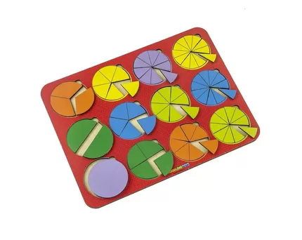 Комплект включает в себя десять кружочков, поделенных на равные части: один целый, а также половинки, три, четыре, пять частей и т.д. Все кружочки имеют одинаковый диаметр, но отличаются цветом. Каждый сегмент подписан: ½ и т.д. Детали могут быть сделаны из плотного картона, листового пластика, фанеры и других материалов.