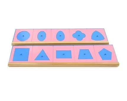 Супруги Никитины активно использовали наработки других педагогов, в частности Марии Монтессори. Они предложили использовать в качестве развивающих занятий вкладыши и рамки из фанеры. Их можно сделать самостоятельно или приобрести в магазине. Набор от бренда Ступеньки творчества в точности соответствует оригинальной методике.