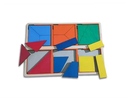 Игра включает в себя семь фигур разной формы и цвета. Они чем-то напоминают игру «Тетрис». Из этих фигур можно собрать разные конструкции. В альбомах задания даны в черно-белом варианте. Это позволит малышу самому подобрать подходящую фигуру, не ориентируясь на цвет.