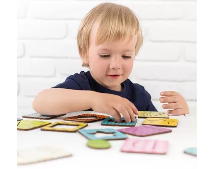- Закрываем окошки. Предложите малышу подобрать фигуры, которые плотно закроют отверстия в квадратных основах. Для детей 1,5-2 лет предложите 4-5 фигур, для старших увеличивайте количество.