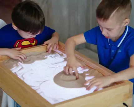 Разложите тонкий слой песка на подносе или используйте стол для рисования песком. Предложите детям рисовать на нем пальцами. Это развивает тактильные ощущения, координацию.