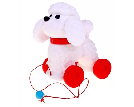 Игрушка выполнена в полном соответствии с требованиями ФГОС. Товар прошел специальную сертификацию. Каталка выглядит, как пудель белого цвета. Ребенок может возить питомца с собой на прогулку за шнурок. Изделие выполнено из пластмассы высокого качества, материал не содержит вредных компонентов.