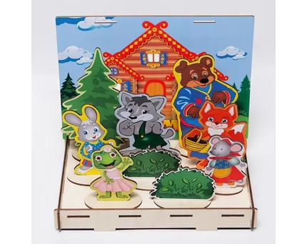 Настольный кукольный театр выполнен из качественной древесины. Товар имеет необходимые сертификаты, изготовлен в соответствии с требованиями ФГОС. Коробка для театра трансформируется в сцену. Для всех фигурок и декораций прилагаются подставки. Изделия покрыты безопасными красками. Поверхность фигурок гладкая. Играть в театр могут дети от трех лет. Набор состоит из семи фигурок персонажей, двух деревьев – декораций, подставок для фигурок и коробки для хранения из дерева.