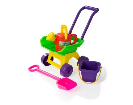 Набор подходит для занятий с песком. С его помощью малыш может построить замки, горы, сделать дороги и каньоны. Комплект подходит для использования в домашних условиях и в детском саду. Малыш может играть с ним в песочнице или на игровых площадках. В садовой тележке можно перевозить разные игрушки и инструменты. Изделия выполнены из пластмассы. В набор входит ведерко, лейка, грабли, совок, садовая тележка.