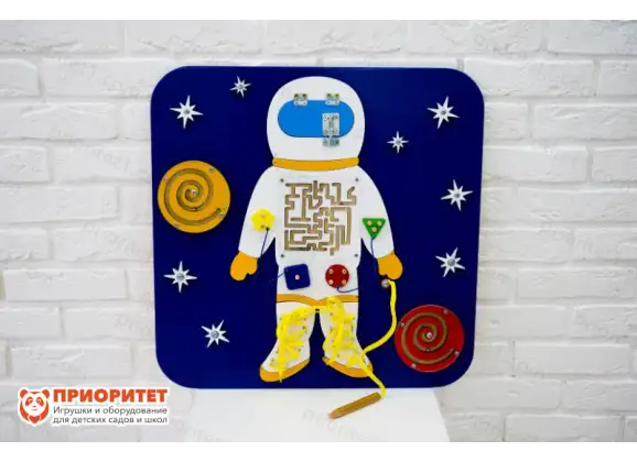 Бизиборд выполнен в космическом стиле. Вместе с храбрым космонавтом дети отправятся изучать космос и звезды. Бизиборд является полезным тренажером для моторики рук. Каждая деталь стимулирует тактильные ощущения и мыслительные процессы. Элементы расположены на нейтральном фоне, благодаря чему внимание ребенка акцентируется именно на деталях. Бизиборд подходит для занятий с детьми в детских садах, развивающих дошкольных учреждениях, игровых и коррекционных центрах и т.д.