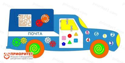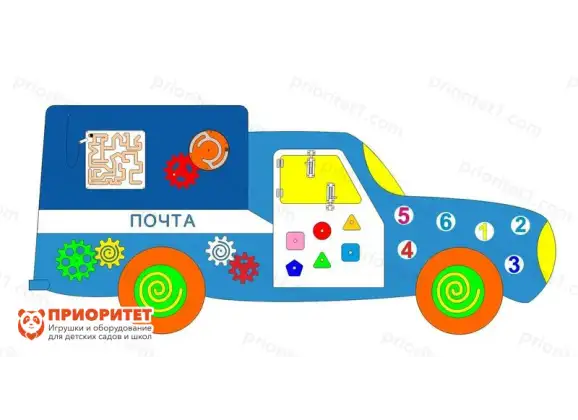 Яркий грузовичок почтальона особо понравится любопытным малышам, которые любят исследовать мир с помощью прикосновений. С помощью этого бизиборда малыш освоит принцип работы простых механизмов с шестернями, научится проходить сложные лабиринты, а также сможет попрактиковаться в навыках счета. Все элементы доски направлены на развитие моторики, что является самым важным навыком малыша, определяющим его дальнейшее развитие.