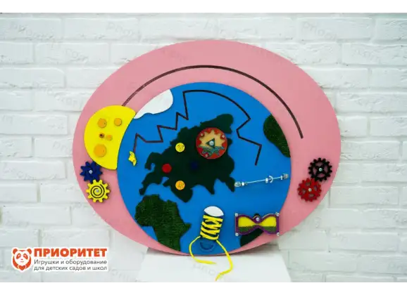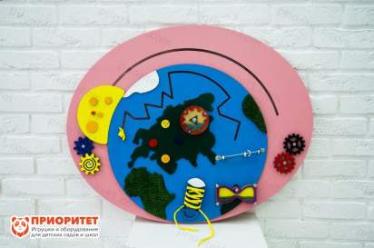 Основная тема бизиборда – космос. Панель напоминает собой необъятную вселенную, полную разнообразных планет и звезд. Во время игры ребята смогут отправиться изучать космос, изучат траекторию движения планет, выучат их названия, познакомятся с особенностями планет и звезд. «Космическая» тема бизиборда будет интересна для юных любопытных носиков и станет первой ступенью к больших наукам.