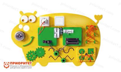Бизиборд выполнен в сочном лимонном цвете. Панель изготовлена в форме улыбчивого бегемота. Вместе с бегемотом детям предстоит изучить много интересного и постараться решить даже самые сложные задания. Панель подойдет для дошкольников и младших школьников. Может использоваться в детских садах, школах, развивающих и развлекательных центрах, в кабинетах психолога или логопеда, дома.