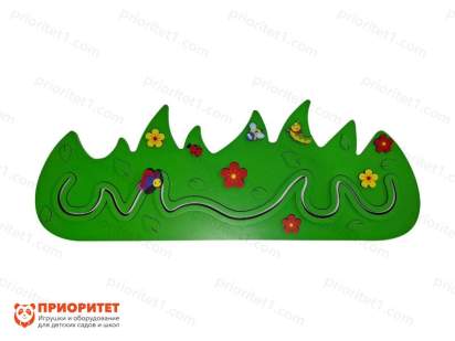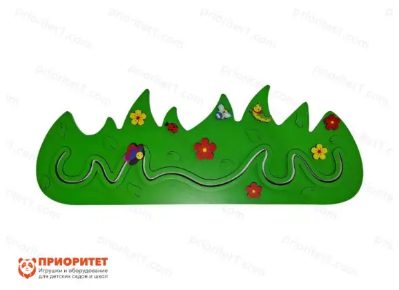 Декоративно-развивающая панель «Травка в поле» предназначена для занятий и игр с детками в возрасте от 1 года. Панель красочная, яркая сделана в форме травки с цветочками, листиками и насекомыми. По всей длине панели вырезана зигзагообразная дорожка с бегунками в виде жучка божьей коровки.