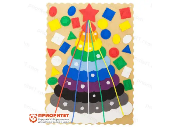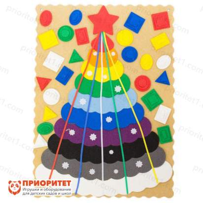 - Задача ребёнка — украсить ёлочку фигурками, входящими в набор. Надо поставить опору из фанеры и установить на ней ось, а затем нанизать ёлочные «ветви» из ковролина. После этого малыш может наряжать ёлку фигурками, белыми звёздочками, верёвочками. Цветные шнуры служат для ёлочки дополнительной опорой и декоративными элементами.