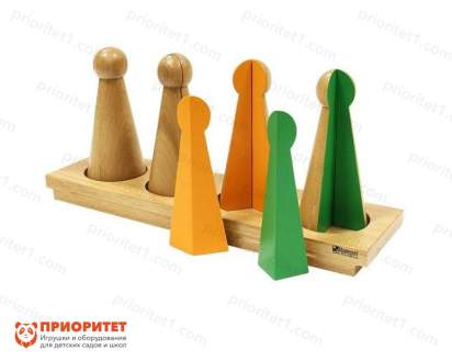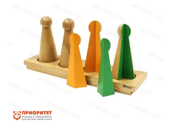 Для освоения темы дробей по методике Монтессори представлен набор в виде кеглей. Состоит комплект из подставки с четырьмя объемными кеглями, одна из которых целая, а остальные поделены на 2,3,4 части.