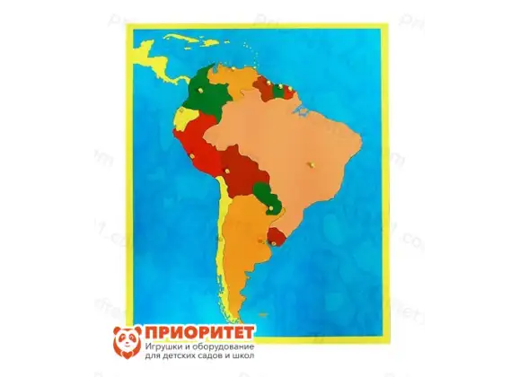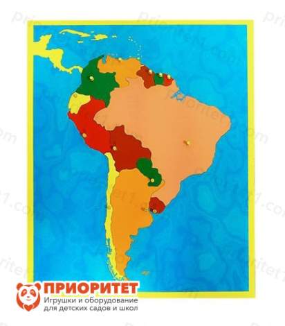 Игровая форма позволяет малышам не потерять интерес к обучению и вызывает положительные эмоции. Дети самостоятельно разбирают и собирают пазл, представляющий собой карту Южной Америки с разноцветными элементами – странами. Для удобства сборки каждая страна имеет ручку. С ее помощью любой элемент легко вынимается и вставляется на место.