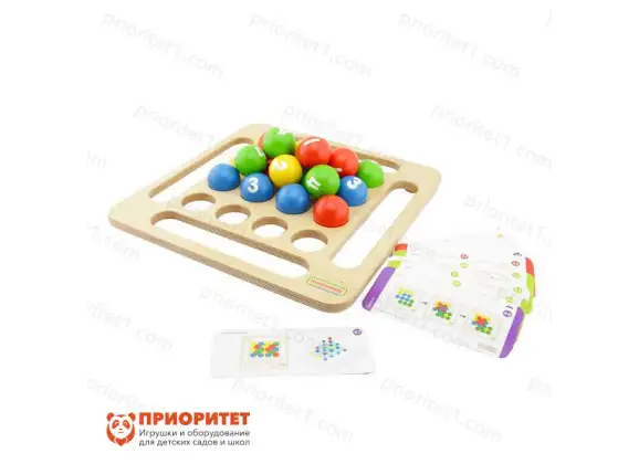 Состоит развивающий набор из нескольких частей: игрового поля, где размещаются во время занятий все задействованные элементы, карточек с заданиями, инструкция и сами шары разного цвета (синий, зеленый, красный, желтый) с нумерацией.