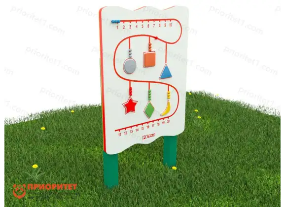 На извивающейся линии расположены различные фигуры, каждая из которых имеет свой цвет. К ним необходимо подобрать бегунки соответствующих оттенков, которые находятся в отдельных зонах, причём каждый бегунок размещён в своей числовой нише. Всего имеется 20 шариков, и все цифры от 1 до 20 обозначены на стенде.