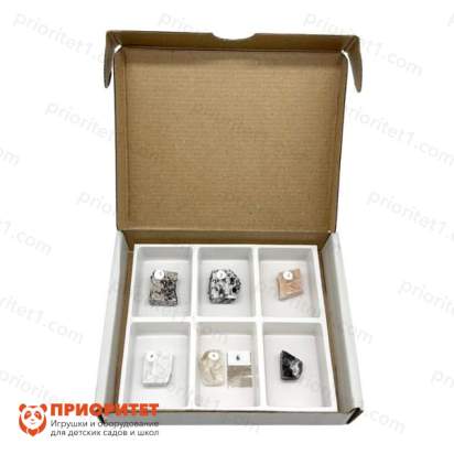 Состав коллекции: гранит розовый, гранит серый, полевой шпат розовый, полевой шпат серый, кварц, слюда - мусковит (белая), слюда - биотит (черная).