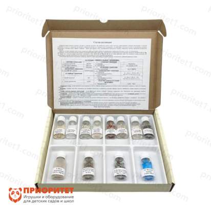 В коллекции представлено 12 видов минеральных удобрений, наиболее часто используемых в сельском хозяйстве. Каждое удобрение сопровождается подробным описанием, включая его химический состав и классификацию. Образцы удобно упакованы в колбы с плотно закрывающимися крышками и размещены в картонной коробке с ложементами для безопасного хранения и транспортировки. Упаковка дополнительно защищена термоусадочной прозрачной плёнкой, что гарантирует сохранность материала.