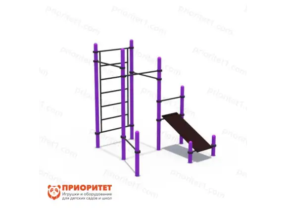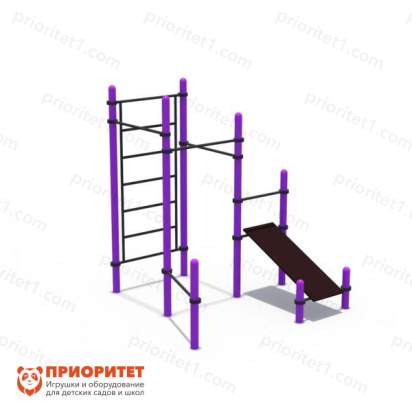 Детский спортивный комплекс с одной скамьей для пресса. Может использоваться самостоятельным агрегатом или в качестве дополнения к иным объектам. Устанавливается преимущественно на улицах. Рекомендуется размещение в образовательных учреждениях (школьных и дошкольных), частных и общественных дворах. Используется одним или несколькими людьми одновременно. Может эксплуатироваться детьми старше 3-х лет. Лучше позволить играть на комплексе без присмотра ребятам 5-7 лет. Малышам – только под наблюдением взрослых. Конструкция изготавливается с учетом действующих стандартов ФГОС. Не требует специального ухода. Отличается долговечностью и сохранением своего функционала на протяжении долгого времени. Это – отличный способ отдохнуть, развить мускулатуру и получить массу положительных эмоций.