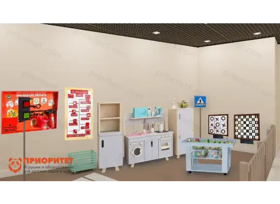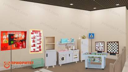 - Игровая зона включает в себя 3 стола, набор из 7 стульев, игровой ландшафтный стол, мобильную тумбу для игрушек и домик для чтения. Весь комплект дополняет мягкий детский коврик на площадь 24 м2.