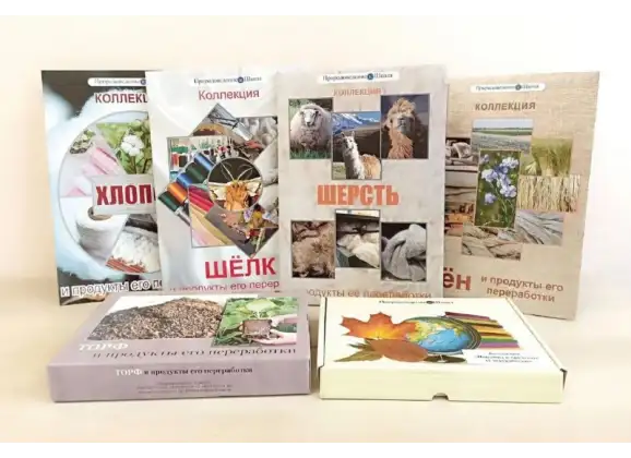 Комплект предназначен для использования в общеобразовательных учреждениях. Он помогает наглядно изучить процессы переработки природного сырья в готовые материалы и продукты, а также понять связь между исходным материалом и конечным изделием. Каждая коллекция оформлена в виде складной папки (паспарту) с рисунками и натуральными образцами — это обеспечивает удобство хранения и демонстрации на уроках.