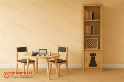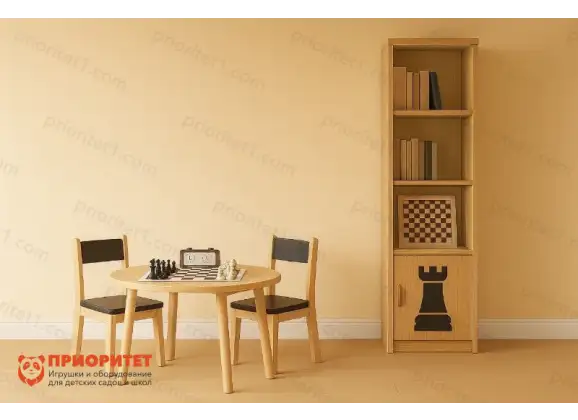 Готовое решение для оформления шахматной зоны в образовательных учреждениях. Комплект включает: круглый стол с тематическим декором, два стула с шахматной символикой и универсальный стеллаж для хранения инвентаря. Все предметы выполнены в едином дизайне, выдержанном в тёплой гамме светлого дерева с чёрными акцентами. Комплект соответствует ФГОС, требованиям СанПиН и адаптирован под рост школьников младших классов (1–4 классы).