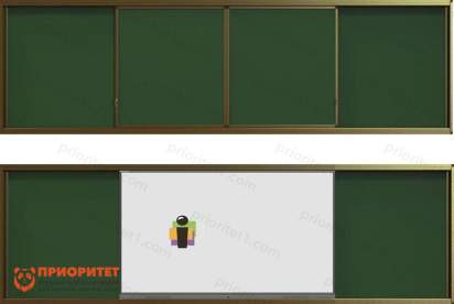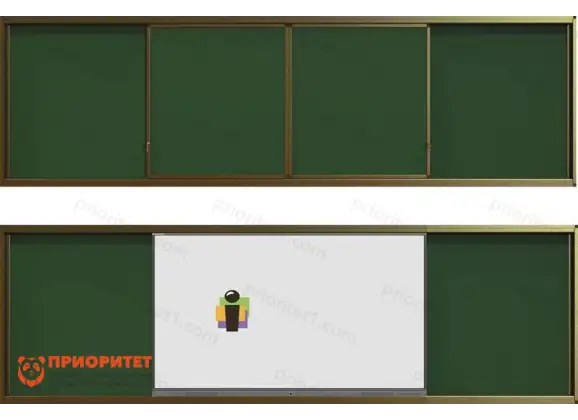 Система включает четыре поверхности: две фиксируются на стене, а две свободно перемещаются по рельсовой системе, что позволяет удобно разместить интерактивную панель в центре учебного помещения. Уникальный дизайн оптимизирует использование пространства и создает комфортные условия для преподавателя.