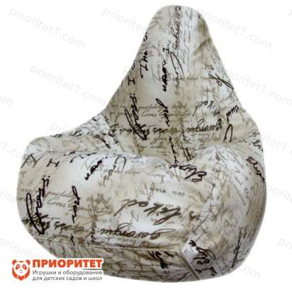 На прочной ткани спокойный рисунок в виде подписей. Немного литературное направление чаще нравится представительницам слабого пола. В кресле удобно сидеть и принимать любые позы. За счет мелких гранул мешок подстраивается под изгибы человеческого тела. Грушевидная форма считается оптимальной, так как всегда присутствует поддержка спин, это максимально снимает напряжение с позвоночника во время отдыха.